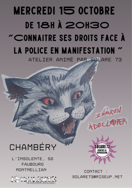 Le collectif SOLARE73 (Solidarité Antirépression) vous propose à un atelier « Mieux connaître ses droits face à la police ».