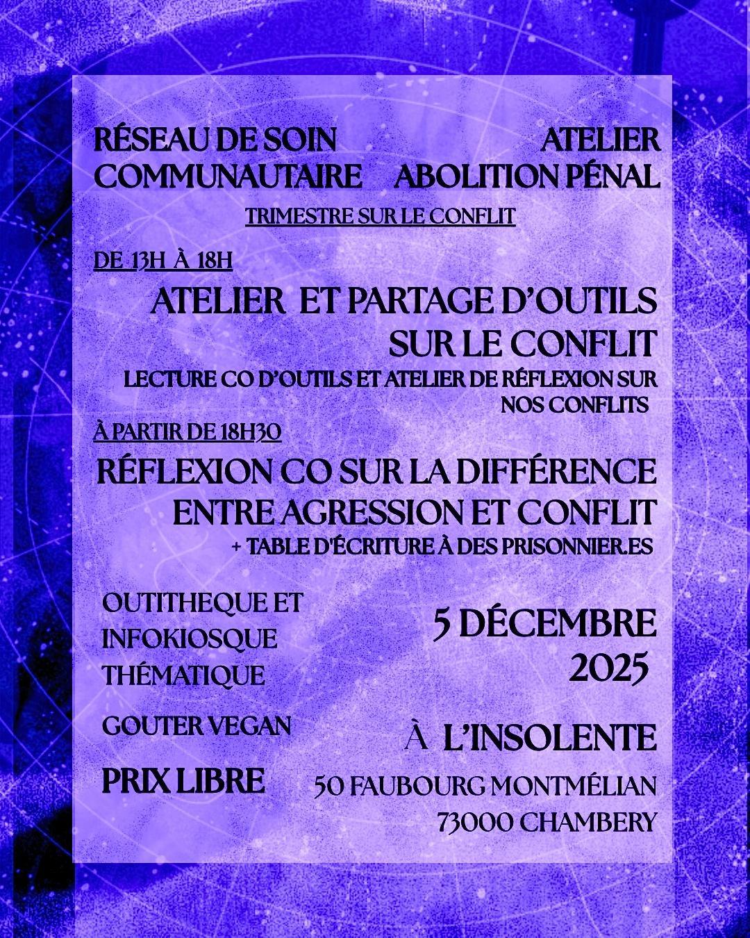 Ce trimestre, on parle prévention et gestion de conflit ! Et cette fois-ci, on fait le lien avec le cycle sur l'abolition pénale de l'Insolente ! Rdv à 18h30, à la suite de l'atelier sur les conflits, pour parler de la différence entre conflit et agression et des enjeux répressifs qui y sont liés.