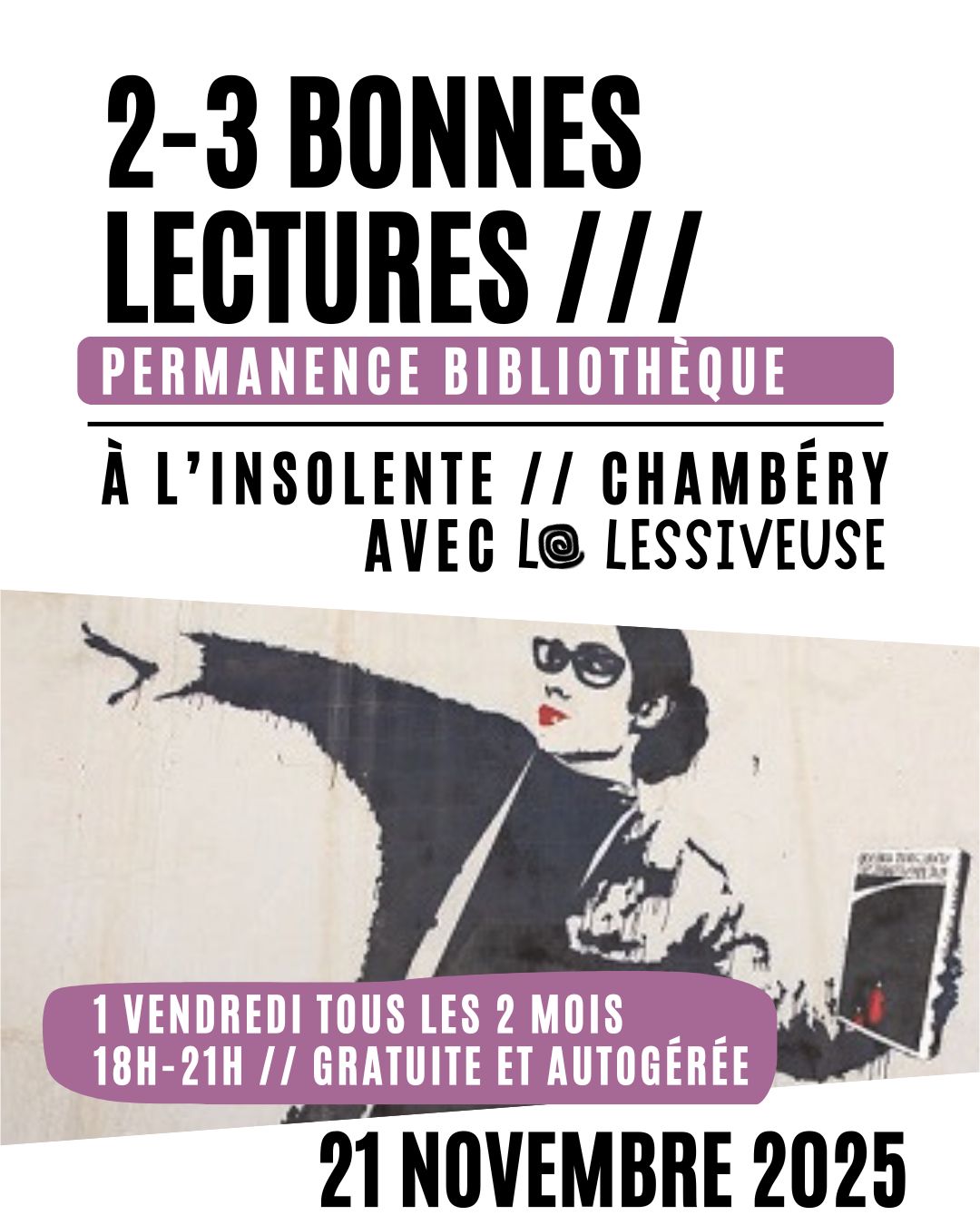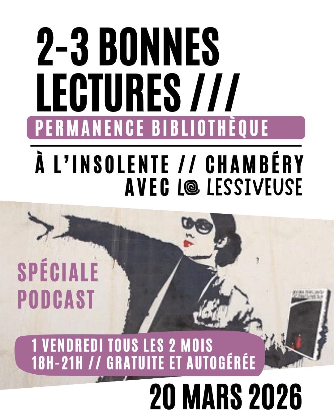 Les permanences de la bibliothèque reprennent, en association avec la Lessiveuse :), avec un rythme d'une perm tous les 2 mois. Consulte l'agenda !! Entre les permanences, les emprunts sont toujours possibles (merci de noter ton nom et ton numéro sur la fiche ;) ) quand l'Insolente est ouverte.