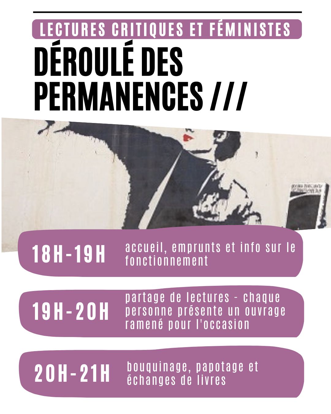 Actuellement, la bibliothèque est en autogestion, il n'y a plus de permanences prévues. Des ateliers peuvent être prévus ponctuellement. En attendant, les emprunts sont toujours possibles (merci de noter ton nom et ton numéro sur la fiche ;) ) quand l'Insolente est ouverte.